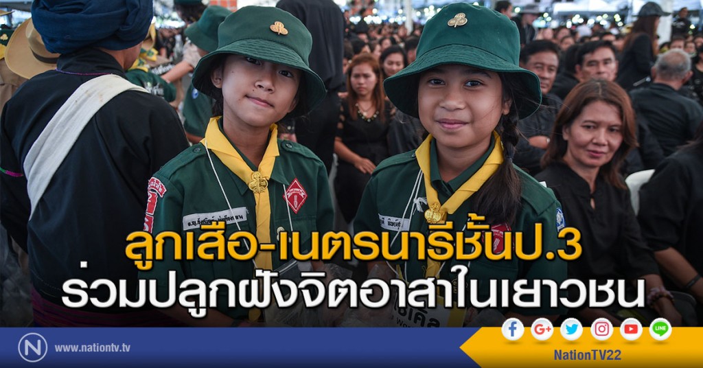 นักเรียนลูกเสือและเนตรนารีจิตอาสาชั้นป.3 ช่วยกันเดินคัดแยกและเก็บขยะจากประชาชน ที่นั่งรอเข้าคิวในจุดพักคอยที่เต้นท์โซนเหนือ เพื่อเข้าสักการะพระบรมศพเบื้องหน้าพระบรมโกศ ที่ พระที่นั่งดุสิตมหาปราสาท ในพระบรมมหาราชวัง เมื่อวันที่ 10 ธันวาคม 2559 ซึ่งคุณครูที่พามากล่าวว่าต้องการปลูกฝังจิตอาสาในเยาวชนและถือเป็นการใช้เวลาว่างให้เกิดประโยชน์