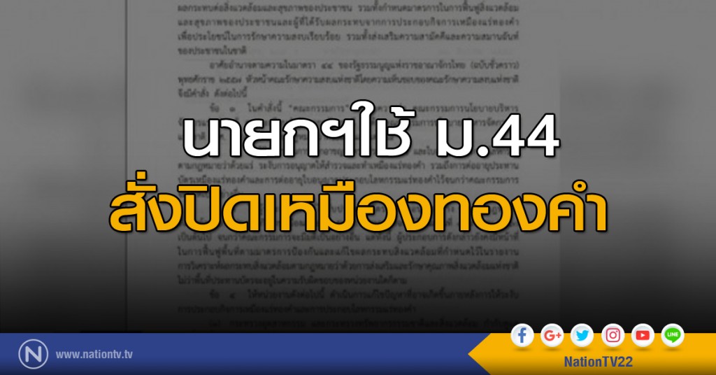 เมื่อวานนี้(13ธ.ค.) ราชกิจจานุเบกษา ได้เผยแพร่ คำสั่งหัวหน้าคณะรักษาความสงบแห่งชาติ ที่ 72/2559 เรื่อง การแก้ไขปัญหาผลกระทบจากการประกอบกิจการเหมืองแร่ทองคำ หลังมีผู้ร้องเรียนและคัดค้านการประกอบกิจการ โดยหัวหน้า คสช. พลเอก ประยุทธ์ จันทร์โอชา อาศัยอำนาจตาม ม.44 สั่งระงับการสำรวจ และทำเหมืองทองคำ โดยคำสั่งนี้ มีผลทำให้ฝ่ายเกี่ยวข้อง ต้องระงับ การออกอาชญาบัตร/ ประทานบัตร และใบอนุญาตประกอบโลหะกรรม รวมถึงระงับการสำรวจ และทำเหมืองแร่ทองคำ รวมถึงต่ออายุประทานบัตร และใบอนุญาตจนกว่าจะมีคำสั่งเป็นอย่างอื่น