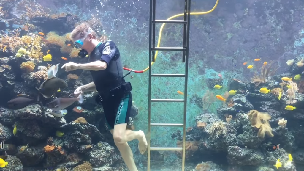 ตู้ปลาความสูง 2.8 เมตร กว้าง 2 เมตร และยาว 5.5 เมตร ที่เต็มไปด้วยปะการังชนิดต่างๆ และมีปลาสวยงามมากกว่า 150 ตัวจาก 30 สายพันธุ์