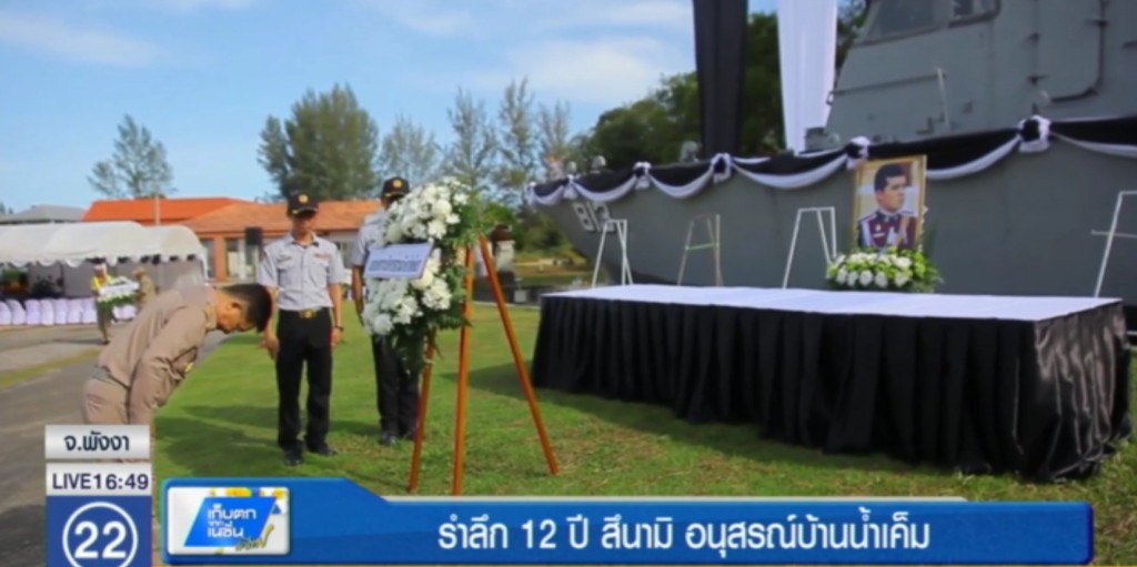 ที่อนุสรณ์สถานเรือ ต.813 ต.คึกคัก อ.ตะกั่วป่า จ.พังงา นายภัคพงศ์ ทวิพัฒน์ผู้ว่าฯ พังงา พร้อมด้วย พ.ต.ท.นิรัตน์ ช่วยจิตต์ สารวัตรตำรวจน้ำ อ.ขนอมจ.นครศรีธรรมราช อดีตผู้ควบคุมเรือ ต.813 หัวหน้าส่วนราชการ อบจ.พังงา ญาติผู้สูญเสียทั้งชาวไทยและชาวต่างชาติ ร่วมกันวางพวงมาลา หน้ารูปคุณพุ่ม เจนเซ่น พระโอรสในทูลกระหม่อมหญิงอุบลรัตนราชกัญญา สิริวัฒนาพรรณวดี จากนั้นร่วมวางดอกกุหลาบสีขาว รำลึกถึงเหตุการณ์สึนามิ เมื่อวันที่ 26 ธ.ค.2547 ในกิจกรรมครบรอบ 12 ปีธรณีพิบัติภัยสึนามิ