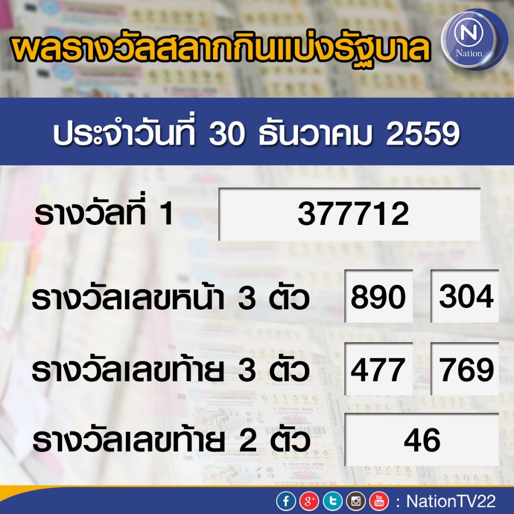 ผลสลากกินแบ่งรัฐบาล งวดประจำวันที่ 30 ธันวาคม 2559 รางวัลที่ 1 : 377712 / รางวัลเลขหน้า 3 ตัว : 304 890 / รางวัลเลขท้าย 3 ตัว : 477 769 / รางวัลเลขท้าย 2 ตัว : 46