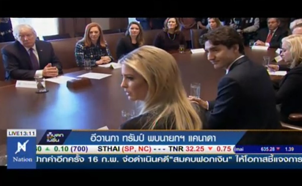 การพบกันครั้งแรกระหว่างอิวานกา ทรัมป์ บุตรสาวคนโตของประธานาธิบดีโดนัลด์ ทรัมป์ ที่รับตำแหน่งที่ปรึกษาอย่างไม่เป็นทางการของบิดา กับนายกรัฐมนตรีจัสตินทรูโด ของแคนาดา ที่ทำเนียบขาว เป็นที่จับจ้องของสื่ออย่างหลีกเลี่ยงไม่ได้ ตั้่งแต่นายกรัฐมนตรีหนุ่มรูปงาม ดึงเก้าอี้ให้เธอนั่ง จนกระทั่งอีวานกาตั้งอกตั้งใจฟังเขาพูดในระหว่างการประชุมโต๊ะกลมภายในห้อง Cabinet Room