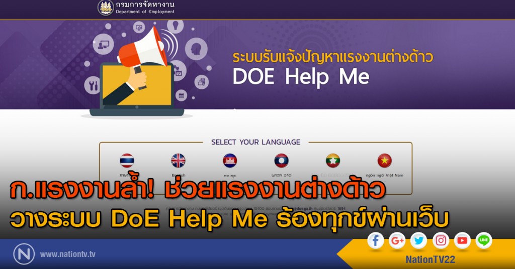กระทรวงแรงงาน โดย นายวรานนท์ ปีติวรรณ รองปลัดกระทรวงแรงงาน รักษาราชการแทนอธิบดีกรมการจัดหางาน กล่าวว่า กรมการจัดหางานเพิ่มช่องทางการร้องเรียน/ร้องทุกข์เกี่ยวกับการทำงานของแรงงานต่างด้าวผ่านระบบ "DoE Help Me" ทางเว็บไซต์ www.doe.go.th/helpme