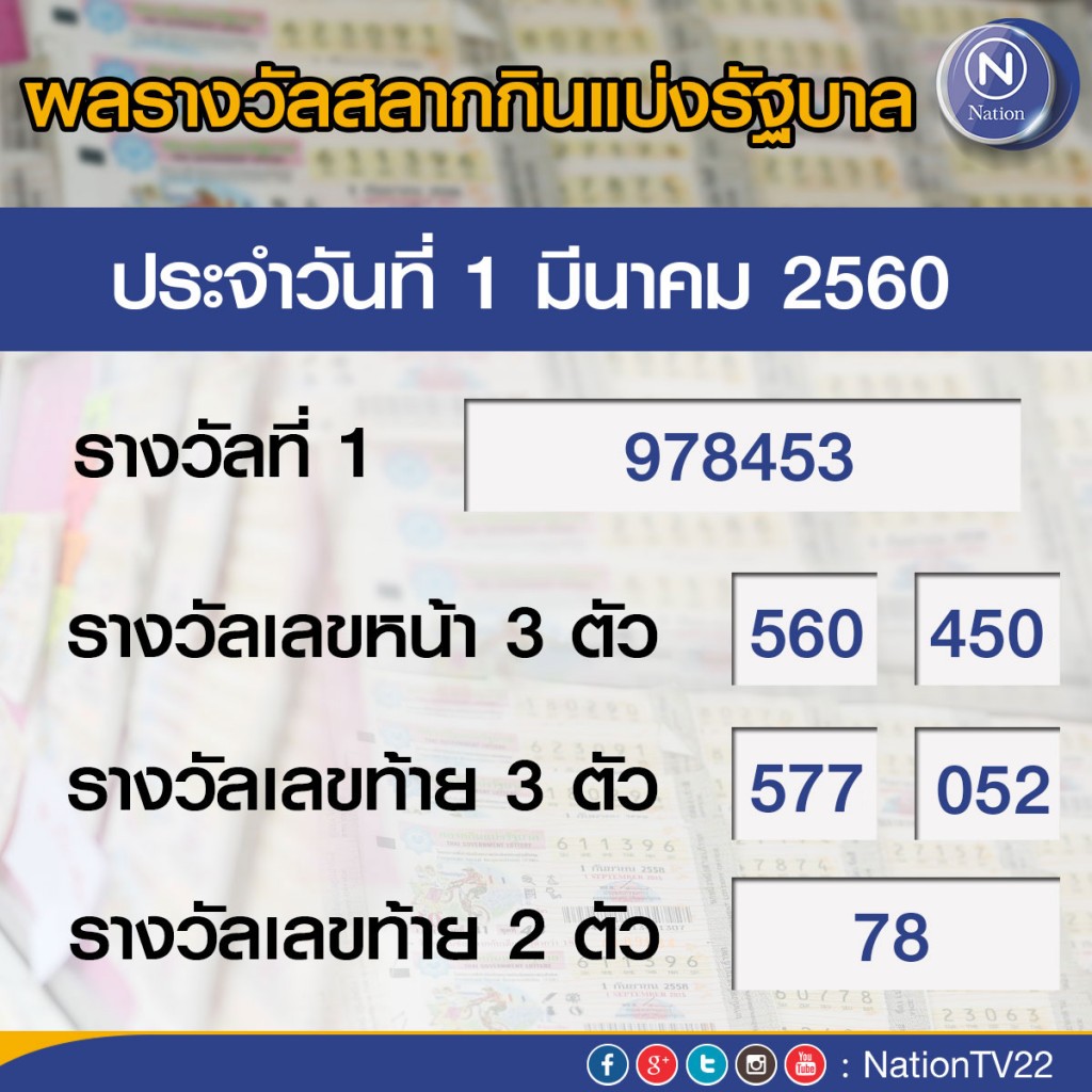 ผลสลากกินแบ่งรัฐบาล งวดประจำวันที่ 1 มีนาคม 2560 รางวัลที่ 1 : 978453 / รางวัลเลขหน้า 3 ตัว : 450 , 560 / รางวัลเลขท้าย 3 ตัว : 577 , 052 / รางวัลเลขท้าย 2 ตัว : 78