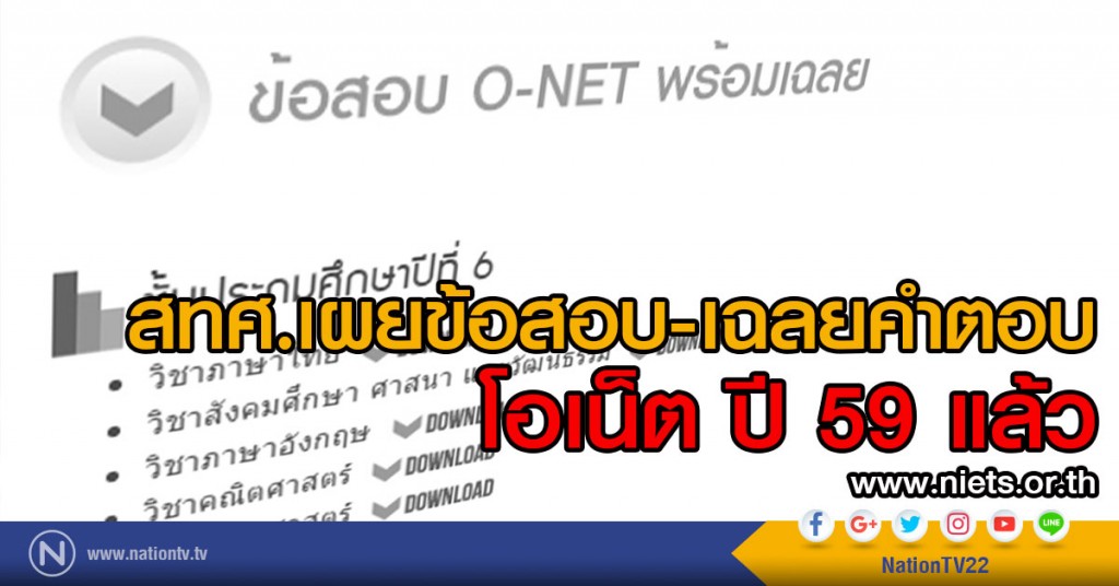 ขณะนี้ สทศ. ได้นำข้อสอบและเฉลยคำตอบ O-NET ชั้นประถมศึกษาปีที่ 6 ชั้นมัธยมศึกษาปีที่ 3 และชั้นมัธยมศึกษาปีที่ 6 ปีการศึกษา 2559 เผยแพร่ทางเว็บไซต์ สทศ. (www.niets.or.th) เป็นที่เรียบร้อยแล้ว เพื่อให้ต้นสังกัดและโรงเรียนได้นำไปใช้ในวางแผนและพัฒนาคุณภาพการเรียนการสอน รวมถึงยกระดับผลสัมฤทธิ์ทางการเรียนให้ดียิ่งขึ้น