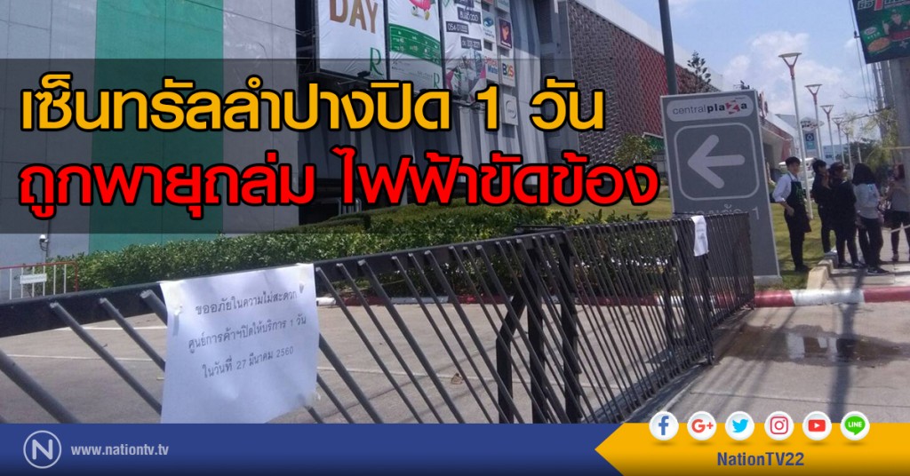 ขณะเดียวกัน ทางประชาสัมพันธ์ศูนย์การค้าเซ็นทรัล พลาซ่า ลำปาง ได้โพสต์ผ่านเฟซบุ๊ค ถึงผู้มีอุปการะคุณลูกค้าของศูนย์การค้าเซ็นทรัลพลาซ่า ลำปางว่า เนื่องด้วยฝนตกหนัก ส่งผลให้เกิดเหตุกระแสไฟฟ้าขัดข้อง ทางศูนย์การค้าฯจึงจำเป็นต้องปิดให้บริการในวันที่ 27 มีนาคม 2560 (เป็นเวลา 1 วัน) และขออภัยในความไม่สะดวกและจะสามารถเปิดให้บริการตามปกติในวันที่ 28 มีนาคม 2560 นี้