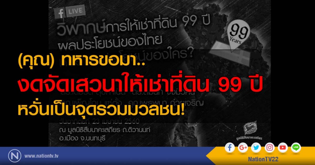 วันนี้ (19 เม.ย.2560) ผู้สื่อข่าวรายงานว่าเกิดกระแสวิจารณ์ทางโซเชียล กรณีมีทหาร ตำรวจ และฝ่ายปกครองในพื้นที่จังหวัดนนทบุรี ได้เข้ามาพบกับตัวแทนมูลนิธิสืบนาคะเสถียร เพื่อขอความร่วมมือให้งดจัดการเสวนาวิพากษ์การให้เช่าที่ดิน 99 ปี ผลประโยชน์ของไทย หรือผลประโยชน์ของใคร? โดยกำหนดจัดวันที่ 23 เม.ย.นี้
