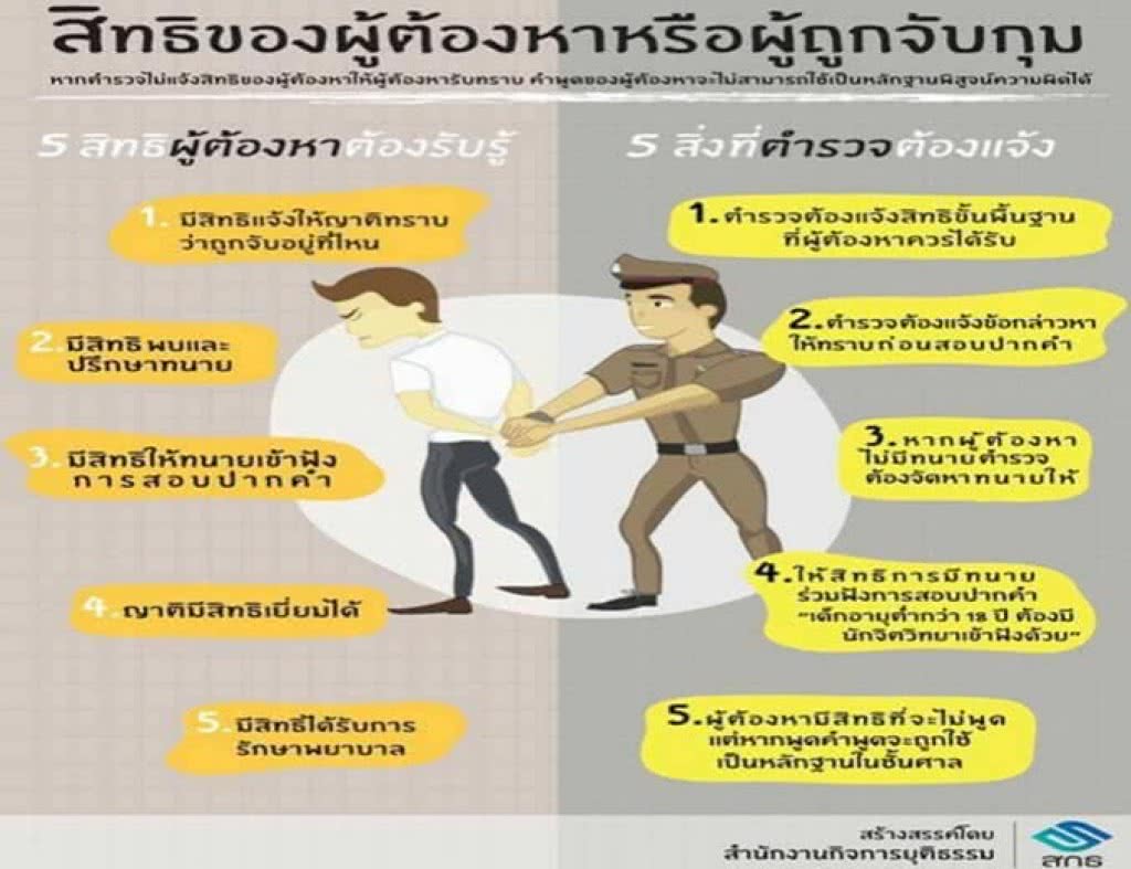 ขณะที่ตำรวจก็ต้องแจ้ง 5 สิ่ง ให้ผู้ต้องหารับทราบ 1.ตำรวจต้องแจ้งสิทธิขั้นพื้นฐานที่ผู้ต้องหาควรได้รับ 2.ตำรวจต้องแจ้งข้อกล่าวหาให้ทราบก่อนสอบปากคำ 3.หากผู้ต้องหาไม่มีทนาย ตำรวจต้องจัดหาทนายให้ 4.ให้สิทธิการมีทนายเข้าร่วมฟังการสอบปากคำ กรณีเด็กอายุต่ำกว่า 18 ปี ต้องมีนักจิตวิทยาเข้าฟังการสอบปากคำด้วย และ 5.ผู้ต้องหาทีสิทธิที่จะไม่พูด แต่หากพูดคำพูดจะถูกใช้เป็นหลักฐานในศาล