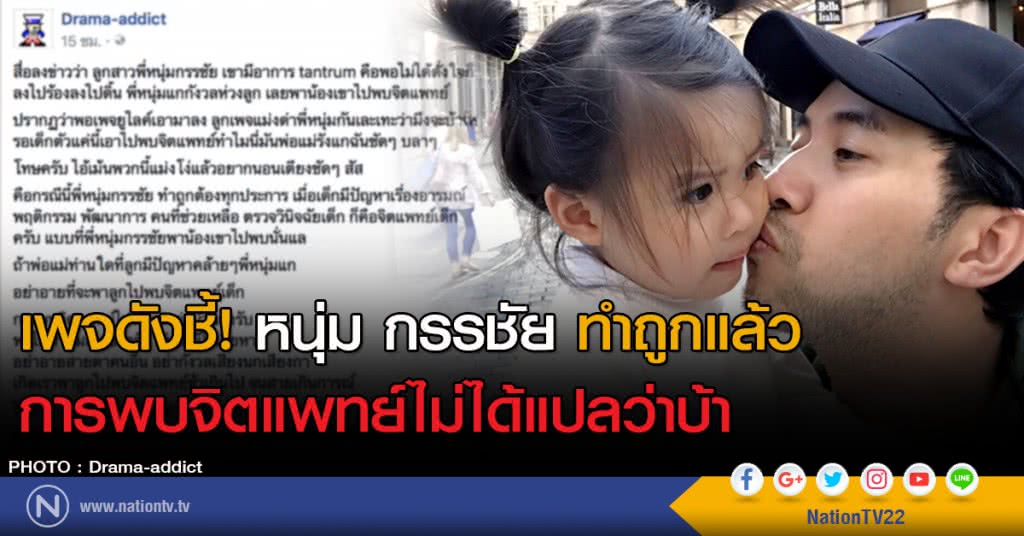 จากในโพสต์ระบุข้อความว่า"สื่อลงข่าวว่า ลูกสาวพี่หนุ่มกรรชัย เขามีอาการ tantrum คือพอไม่ได้ดั่งใจก็ลงไปร้องลงไปดิ้น พี่หนุ่มแกกังวลห่วงลูก เลยพาน้องเขาไปพบจิตแพทย์ปรากฏว่าพอเพจยูไลค์เอามาลง ลูกเพจด่าพี่หนุ่มกันเละเทะว่ามึงจะบ้าเหรอเด็กตัวแค่นี้เอาไปพบจิตแพทย์ทำไมนี่มันพ่อแม่รังแกฉันชัดๆ บลาๆโทษครับ ไอ้เม้นพวกนี้โง่แล้วอยากนอนเตียงชัดๆคือกรณีนี้พี่หนุ่มกรรชัย ทำถูกต้องทุกประการ เมื่อเด็กมีปัญหาเรื่องอารมณ์ พฤติกรรม พัฒนาการ คนที่ช่วยเหลือ ตรวจวินิจฉัยเด็ก ก็คือจิตแพทย์เด็ก ครับ แบบที่พี่หนุ่มกรรชัยพาน้องเขาไปพบนั่นแลถ้าพ่อแม่ท่านใดที่ลูกมีปัญหาคล้ายๆพี่หนุ่มแกอย่าอายที่จะพาลูกไปพบจิตแพทย์เด็กการพบจิตแพทย์ไม่ได้แปลว่าบ้านะครับพาไปหาหมอเถอะครับ มันไม่มีไรเสียหายอย่าอายสายตาคนอื่น อย่ากังวลเสียงนกเสียงกาเกิดเราพาลูกไปพบจิตแพทย์ช้าเกินไป จนสายเกินการณ์ไอ้พวก.. พวกนั้นมันไม่ช่วยไรคุณหรอกนะครับ เชื่อกุสิ"