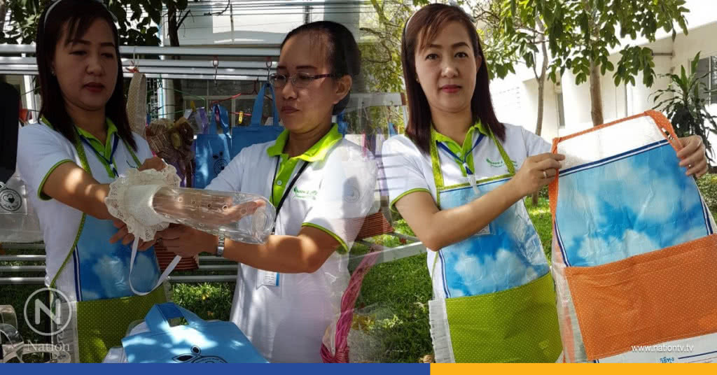 4.กระเป๋าจากก้นขวดพลาสติดเหลือใช้ เนื่องจากในแต่ละวันรพ.มีขวดน้ำพลาสติกที่มีการดื่มน้ำหมดแล้วจำนวนมาก จึงนำมาออกแบบเป็นกระเป๋ากระปุกไว้ใส่เหรียญหรือสิ่งของต่างๆที่เหมาะสม โดยเป็นการนำขวดน้ำพลาสติกมาตัดเอาส่วนก้น 2 ขวด แล้วนำมายิงกาวติดซิปเชื่อมทั้ง 2 อันเข้าด้วยกัน พร้อมเพิ่มความเก๋ไก๋ด้วยผ้าลูกไม้ หรือนำขวดน้ำพลาสติกมาตัดแบ่งครึ่งก่อนเชื่อมต่อด้วยซิป กลายเป็นอุปกรณ์ใส่ของใช้ หรืออุปกรณ์บรรจุหีบห่อที่น่ารัก ซึ่งรพ.นำมาใช้นำร่องในการใส่กล้วยกรอบ และลูกอมไว้สำหรับแจก