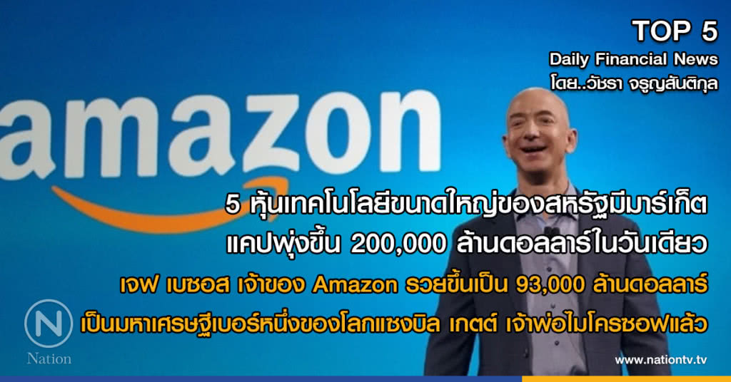 โดยที่เจฟ เบซอส ซึ่งเป็นเจ้าของ Anazon กลายเป็นมหาเศรษฐีอันดับหนึ่งของโลก โดยมีมูลค่าหุ้นที่เพิ่มขึ้นถึง 1 หมื่นล้านดอลลาร์มาอยู่ที่ 9.3 หมื่นล้านดอลลาร์ แซงหน้าบิล เกตต์ ซึ่งตกไปเป็นอันดับสองมีมูลค่าหุ้นมาร์เก็ตแคปที่ 8.8 หมื่นล้านดอลลาร์