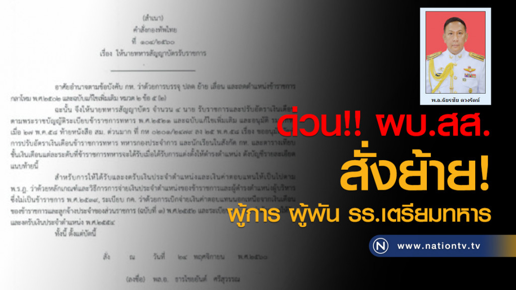 มีคำสั่งกองทัพไทยที่ 104/2560 ลงวันที่ 24 พฤศจิกายน และลงนามโดย พลเอก ธารไชยยันต์ ศรีสุวรรณ ผู้บัญชาการทหารสูงสุด ให้ย้าย พันเอก ฉัตรชัย ดวงรัตน์ ผู้บังคับการกรมนักเรียนโรงเรียนเตรียมทหาร สถาบันวิชาการป้องกันประเทศ ไปดำรงตำแหน่ง นายทหารปฏิบัติการประจำกองบัญชาการกองทัพไทย / และให้ พันเอก เบญจพล เดชาติวงศ์ ณ อยุธยา รองผู้บังคับการ กรมทหารราบที่ 21 รักษาพระองค์ มาดำรงตำแหน่งแทน