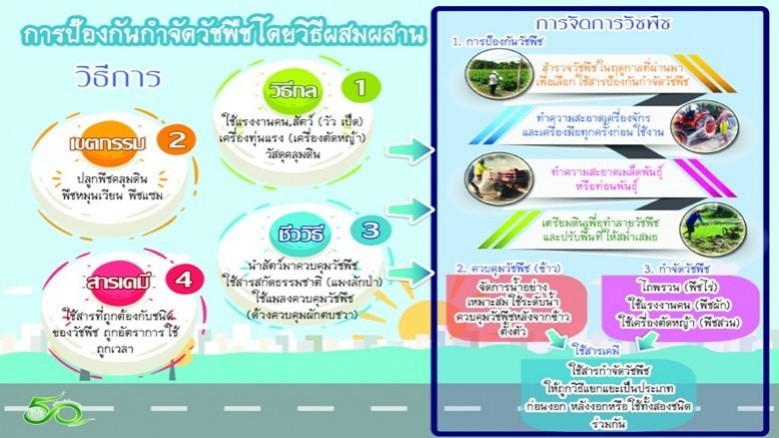 การป้องกันกำจัดวัชพืชด้วยวิธีผสมผสาน มี 4 วิธี ได้แก่ วิธีกล คือการใช้แรงงานคน สัตว์ เครื่องทุ่นแรง วัสดุคลุมดิน หรือการเผาทำลายวัชพืช วิธีเขตกรรม คือ การลดปัญหาวัชพืชเติบโตแย่งอาหารพืชที่ต้องการปลูก โดยใช้เมล็ดพันธุ์พืชที่ปลูกให้สูงกว่าปกติ จัดการปุ๋ยให้ถูกต้องเหมาะสมหรือปลูกพืชหมุนเวียน สำหรับชีววิธีก็ได้แก่การใช้แมลง สัตว์ หรือโรคพืชมาช่วยป้องกันกำจัดวัชพืช