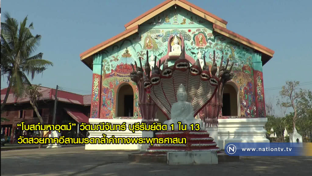 ประชาชนนักท่องเที่ยวชมความงดงามโบส์ถมหาอุตม์ วัดมณีจันทร์ อ.พุทไธสง จ.บุรีรัมย์ ติด 1 ใน 13 วัดสวยของภาคอีสาน ที่สร้างสรรค์ภาพจิตรกรรมผนังด้านนอกอุโบสถทั้ง 4 ด้าน ด้วยงานศิลปะตัดกระจกสี เป็นภาพทางพุทธประวัติเรื่องราวสำคัญที่เกิดขึ้นในท้องถิ่นสะท้อนถึงวัฒนธรรมและประวัติศาสตร์ของคนอีสาน ถือเป็นมรดกล้ำค่าทางพระพุทธศาสนา
