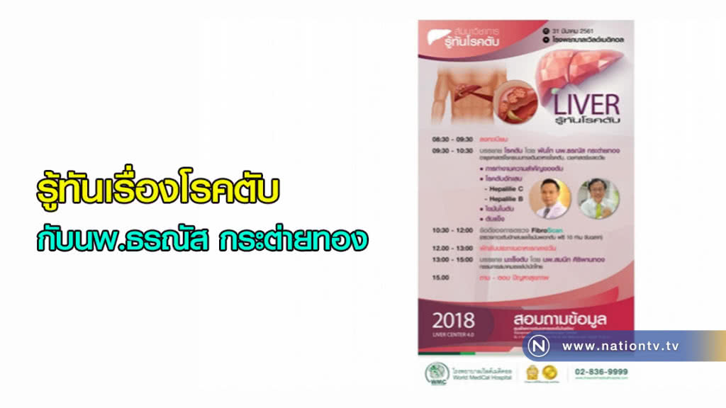 และการบรรยายโรคมะเร็งตับ โดย นพ.สมนึก ศิริพานทอง กรรมการสมาคมเซลล์บำบัดไทย อีกทั้งทำความรู้จักข้อดีของการตรวจเครื่องไฟโบรสแกน และร่วมลุ้นตรวจภาวะตับอักเสบและไขมันพอกตับจำนวน 10 ท่าน (ภายในงาน) ในวันเสาร์ที่ 31 มีนาคม ตั้งแต่เวลา 08.30-15.00 น. ที่ชั้น 22 โรงพยาบาลเวิลด์เมดิคอล สอบถามเพิ่มเติมและลงทะเบียนเข้าอบรมได้ที่ศูนย์โรคทางเดินอาหารและเอ็นโดสโคป ชั้น 3 โรงพยาบาลเวิลด์เมดิคอล โทร.0-2836-9999 ต่อ 3821