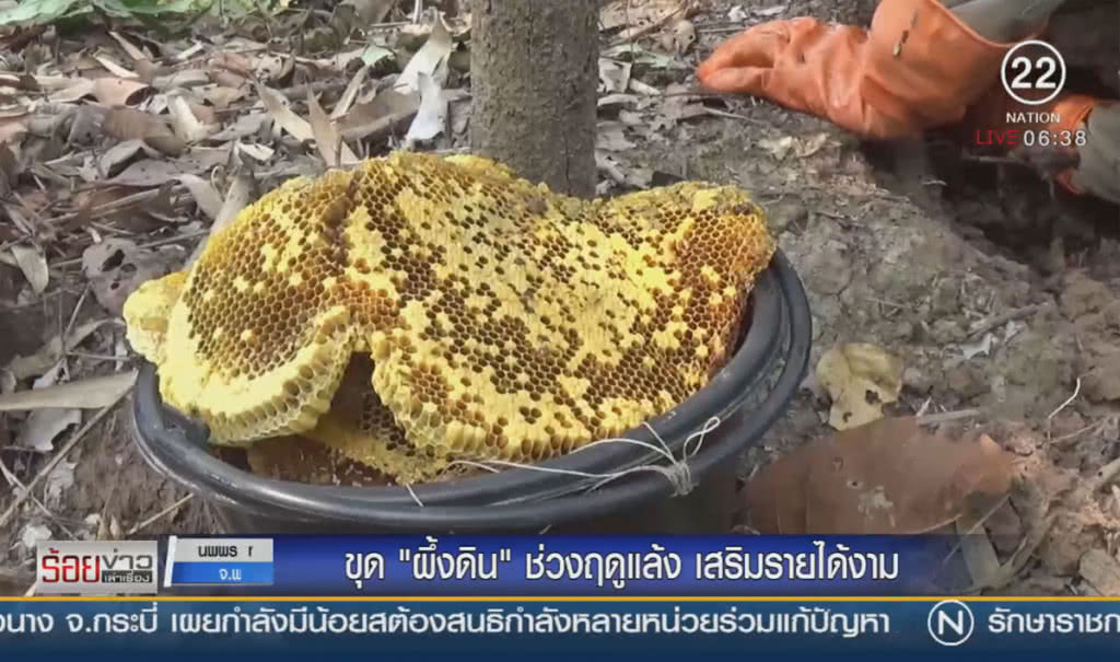 จากนั้นจึงลงมือขุด ซึ่งปกติผึ้งดินจะอยู่ไม่ลึกโดยจะวางรังเป็นชั้น ๆ เรียงกันอย่างมีระเบียบ อาจจะมีตั้งแต่ 3 ถึง 7 ชั้นเลยล่ะค่าาาา