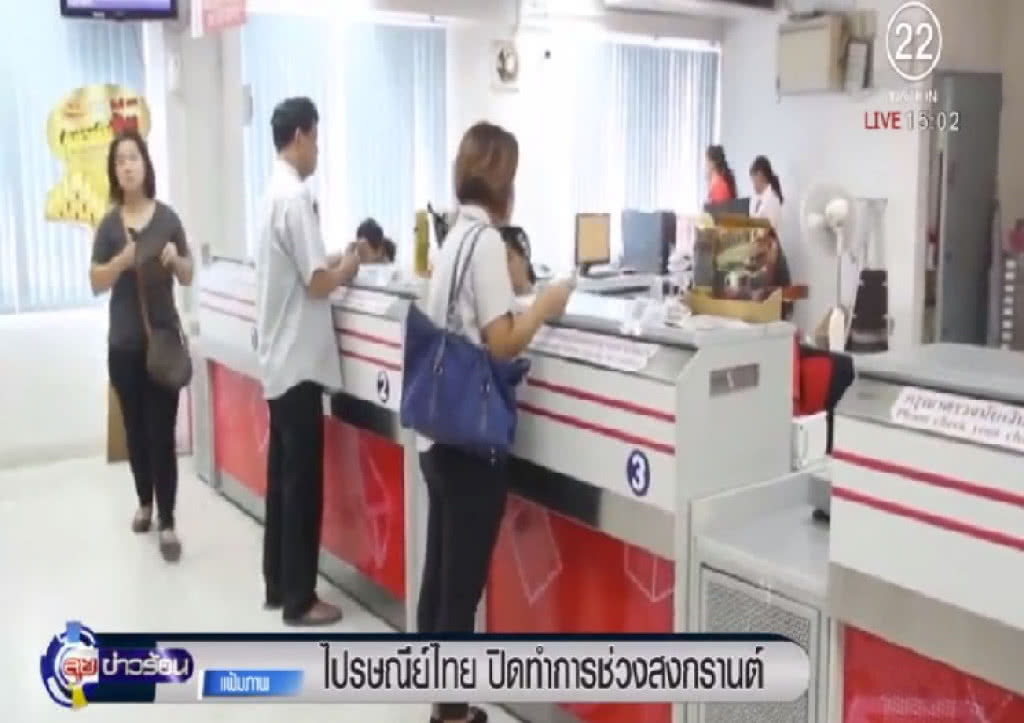 บริษัท ไปรษณีย์ไทย จำกัด (ปณท.) แจ้งปิดทำการในช่วงเทศกาลสงกรานต์ ประจำปี 2561 ตั้งแต่วันที่ 12 16 เมษายน 2561 ซึ่งที่ทำการไปรษณีย์ และศูนย์ไปรษณีย์จะปิดให้บริการทุกแห่งทั่วประเทศ รวมถึงที่ทำการไปรษณีย์ในพื้นที่ท่าอากาศยาน เคาน์เตอร์บริการไปรษณีย์ในศูนย์การค้า และสถานีบริการน้ำมัน แนะผู้ใช้บริการ ฝากส่งสิ่งของผ่านไปรษณีย์ล่วงหน้า และสำหรับบริการไปรษณีย์ด่วนพิเศษ (EMS) ควรใช้บริการฝากส่งภายในวันที่ 10 เมษายน 2561 ก่อนเวลา 12.00 น. ทั้งนี้ ไปรษณีย์ไทยจะเปิดให้บริการตามปกติ ในวันอังคารที่ 17 เมษายน 2561
