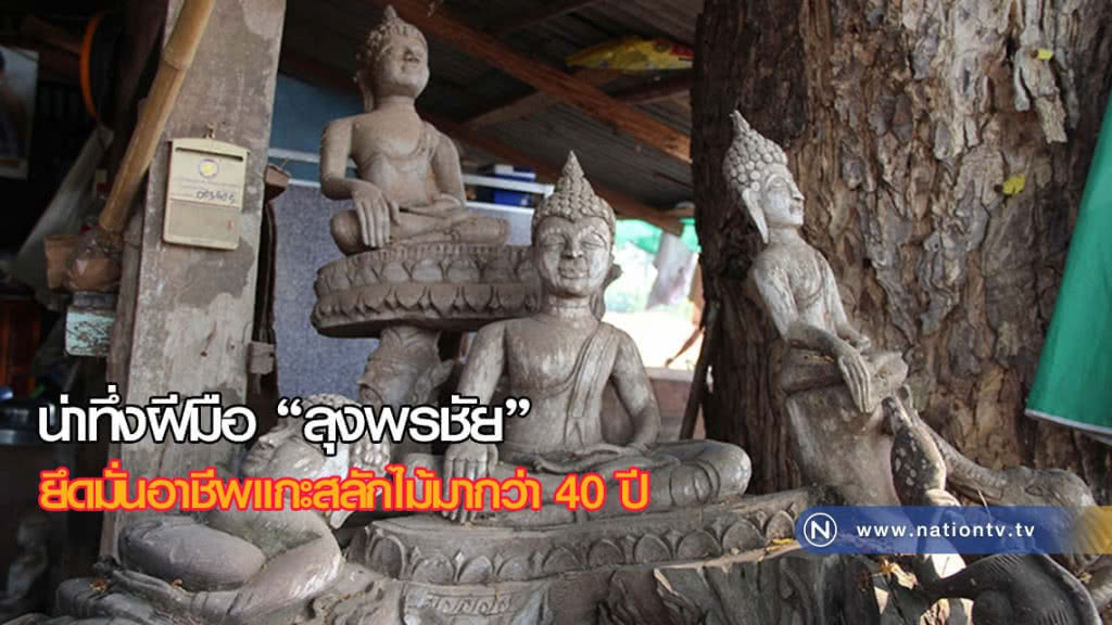 ลุงพรชัย ได้เล่าให้ฟังว่า ตนเรียนจบแค่ชั้น ป.4 โรงเรียวัดแถวบ้าน มีความใฝ่ฝันตั้งแต่เด็กว่าอยากจะไปประเทศอินเดีย อยากไปรู้แหล่งกำเนิดของพระพุทธเจ้า ทั้งๆที่ก็ไม่รู้ว่าประเทศอินเดียอยู่ที่ไหน จึงได้แต่จินตนาการ และอยากเห็นเป็นรูปเป็นร่างเลยลองแกะสลักดู แต่ทางครอบครัวเป็นคนโบราณทำไร่ไถ่นา พ่อกับแม่ก็ด่าประจำ ตนเลยต้องอาศัยเลิกเรียนแล้วแอบเข้าป่าแอบไปนั่งแกะสลัก เย็นๆ หรือหิวข้าวก็ค่อยกลับบ้านจนพอเริ่มโตก็หาความรู้ด้านนี้เพิ่มเติมด้วยการศึกษาเรียนรู้ด้วยตนเอง จนใช้ยึดเป็นอาชีพช่างแกะสลักเรื่อยมาจนถึงปัจจุบันก็ประมาณ 40 ปี ส่งเสียลูกเรียนจนจบปริญญาตรีด้วยเงินค่าแกะสลักถึง 3 คน แต่ลูกเขาก็ทำงานอยู่กรุงเทพฯกันหมด ไม่มีใครสานต่อในอาชีพนี้ ตนเองก็ยังรักงานด้านนี้อยู่รู้สึกมีความสุขทุกครั้งที่ได้จินตนาการรูปตามที่ต้องการ มีความสุขทุกครั้งที่ได้ใช้สิ่วตอกลงไปจากขอนไม้ธรรมดาๆ จนกลายเป็นรูปเป็นร่างสร้างเงินเลี้ยงตัวเองและครอบครัวมาจนถึงปัจจุบันนี้