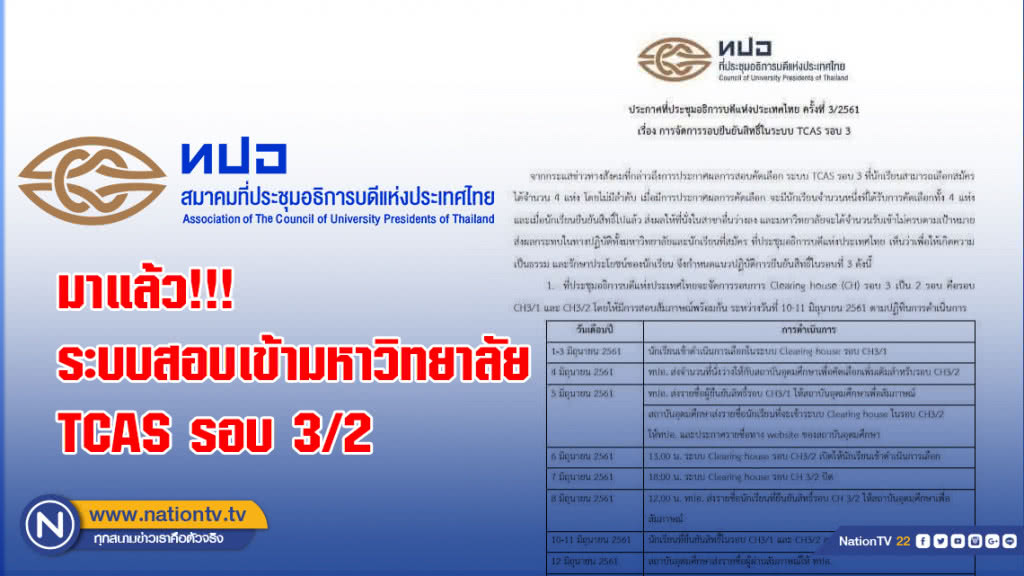 1.สมาคมที่ประชุมอธิการบดีแห่งประเทศไทยจะเพิ่มการ Clearing house (CH) ในรอบ 3 เป็น 2 ครั้ง คือ CH3/1 และ CH3/2 โดยให้มีการสอบสัมภาษณ์พร้อมกัน ระหว่างวันที่ 10-11 มิถุนายน 2561 ตามปฏิทินการดำเนินการ