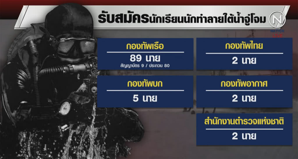 กองเรือยุทธการ ออกประกาศรับสมัครนักเรียนนักทำลายใต้น้ำจู่โจม ปีงบประมาณ 2562 จำนวน 100 นาย คุณสมบัติต้องเป็นทหารใน 4 เหล่าทัพ หรือสำนักงานตำรวจแห่งชาติ สำหรับนายทหารชั้นสัญญาบัตรยศไม่เกิน ร้อยเอกหรือเทียบเท่า ส่วนชั้นประทวนไม่เกินยศสิบเอก หรือเทียบเท่า ที่สำคัญอายุต้องไม่เกิน 29 ปี ป็นผู้มีความประพฤติดีมีผู้บังคับบัญชารับรอง สัดส่วนการรับสมัครตามที่คุณผู้ชมเห็นอยู่ที่หน้าจอ (มีเพลท) มากสุดคือกองทัพเรือ 89 นาย ที่เหลือลดหลั่นกันไป