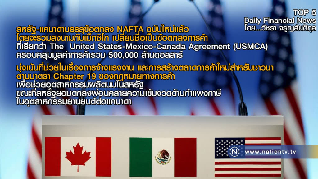 1. สหรัฐอเมริกาและแคนาดาได้บรรลุข้อตกลงการค้าเสรีอเมริกาเหนือ (NAFTA) ฉบับใหม่เมื่อวันที่ 30 กันยายนแล้ว โดยอยู่ระหว่างรอการอนุมัติในขั้นตอนสุดท้าย นอกจากนี้ ช้อตกลง NAFTA ใหม่นี้ยังครอบคลุมปริมาณการค้า 3 ประเทศในทวีปอเมริกาเหนือทั้งสหรัฐ แคนาดา และเม็กซิโก คิดเป็นมูลค่ารวม 500,000 ล้านดอลลาร์
