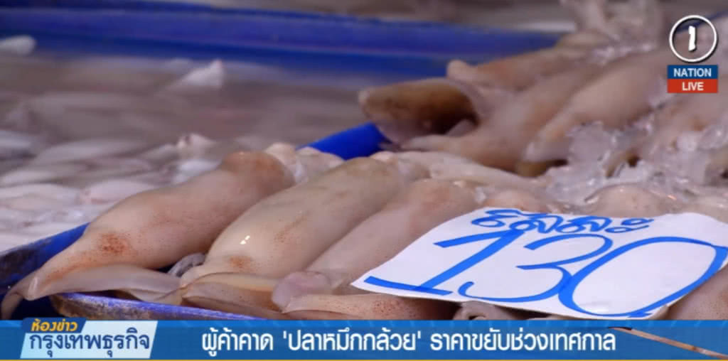สอดคล้องกับพ่อค้าขายกุ้งและปลาหมึกร้านนี้ก็บอกว่า อาหารทะเลส่วนมากไม่ได้มีราคาตกต่ำลง จะมีก็แค่ปลาหมึกกล้วยที่มีราคาตกลงเฉลี่ยกิโลกรัมละ 10 บาท ส่วนกุ้งก็ยังคงราคาเท่าเดิม ซึ่งพ่อค้ายืนยันราคาปลาหมึกกล้วยที่ตกในช่วงนี้เป็นเรื่องปกติ แต่พอถึงช่วงเทศกาลราคาก็จะกลับมาสูงขึ้นเหมือนเดิม