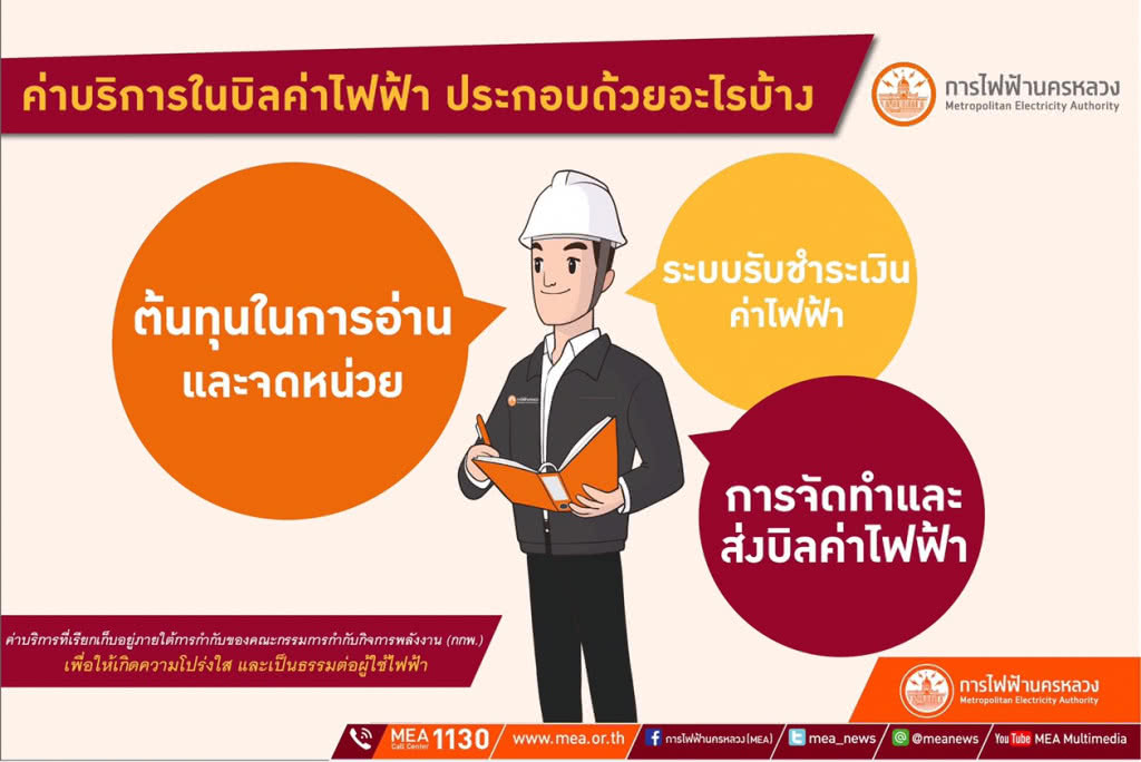 อย่างไรก็ตาม หากผู้ใช้ไฟฟ้ามีข้อสงสัยเกี่ยวกับอัตราค่าไฟฟ้าสามารถศึกษารายละเอียดเพิ่มเติมได้ที่เว็บไซต์ กฟน. www.mea.or.th หรือ MEA Smart Life Application ดาวน์โหลดฟรี ที่ http://is.gd/KlyQKF และสามารถสอบถามข้อมูลอื่น ๆ เพิ่มเติมได้ที่ศูนย์บริการข้อมูลผู้ใช้ไฟฟ้าการไฟฟ้านครหลวง MEA Call Center 1130 ได้ตลอด 24 ชั่วโมง