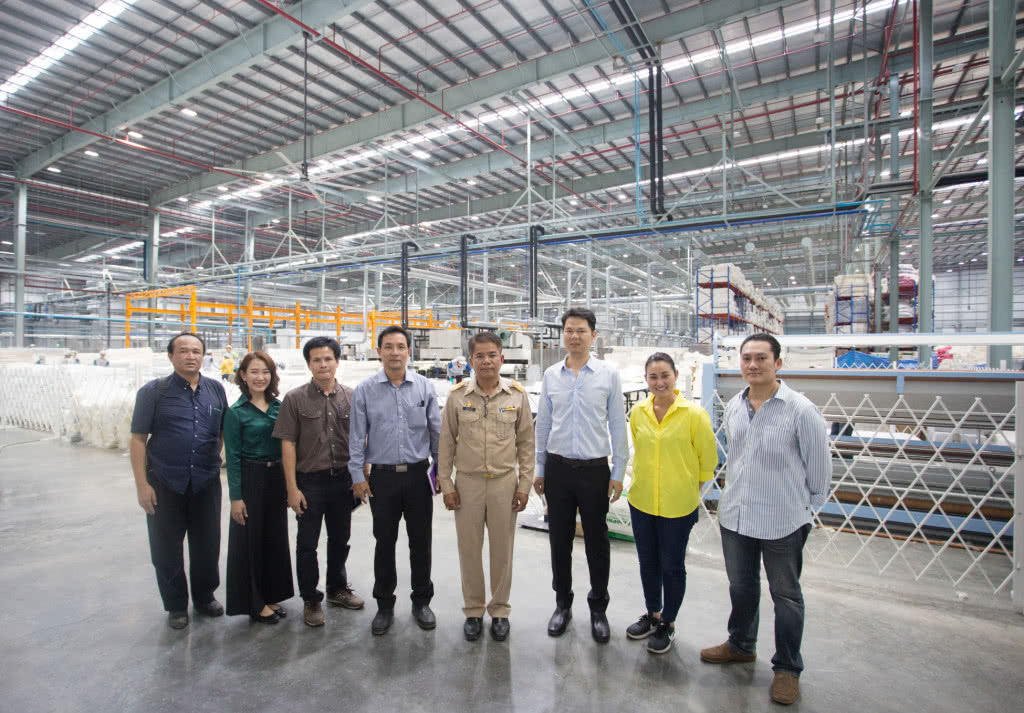 สหวัฒน์ โสภา (กลาง) หัวหน้าสำนักงาน อุตสาหกรรมจังหวัดปทุมธานี เข้าเยี่ยมชม โรงงานผลิตหมอนและที่นอนยางพาราแห่งใหม่ของบริษัท กรีน ลาเท็กซ์ จำกัด ซึ่งตั้งอยู่ในนิคมอุตสาหกรรมนวนคร