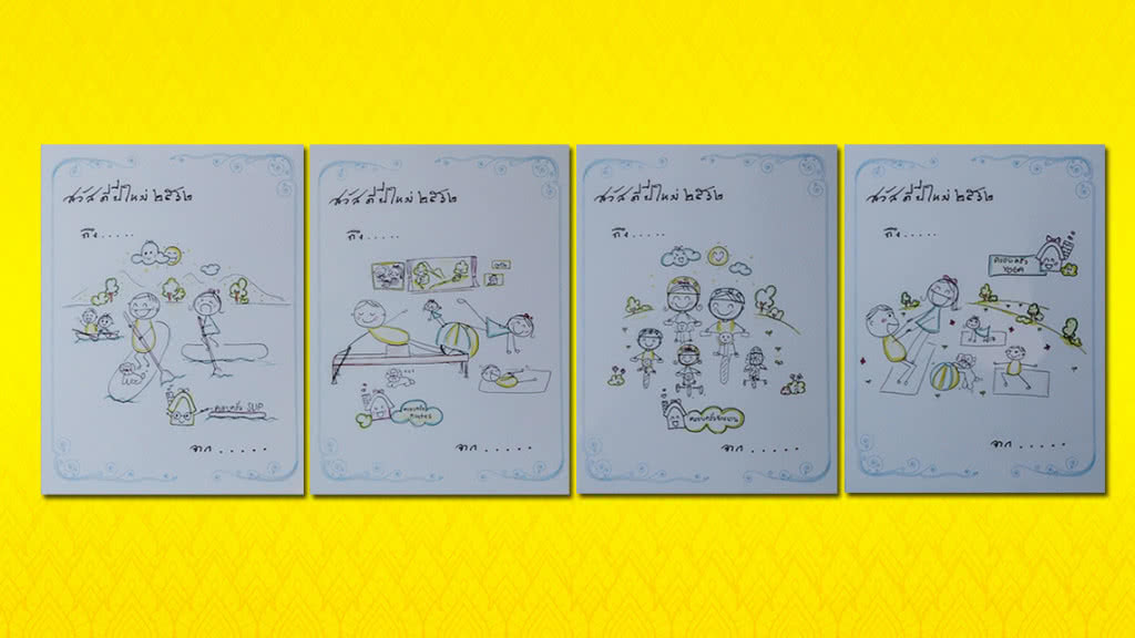 บัตรอวยพรแบบที่ 4 เป็น "ครอบครัว Pilates" พิลาทิส เป็นการออกกำลังกาย ที่เน้นการสร้างความแข็งแรงให้กับร่างกาย โดยเน้นความแข็งแรงของแกนกลางของลำตัว สร้างความแข็งแรงให้กระดูกสันหลัง รวมถึง สร้างความยืดหยุ่นควบคู่ไปด้วย ช่วยให้ร่างกายทำงานสัมพันธ์กัน ทำให้รูปร่างเฟิร์ม บุคลิกดูดี การเดินการนั่ง ดูสง่างามมากขึ้น