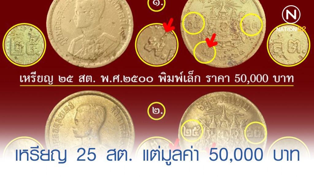 สำหรับ เหรียญ 25 สตางค์ ปี พ.ศ.2550 แบบพิมพ์เล็ก จะมีมูลค่า 50,000 บาท แต่หากเป็นเหรียญ 25 สตางค์ พ.ศ.2500 แบบธรรมดา จะมีราคา 10 บาท