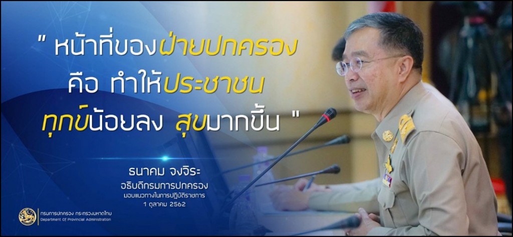 นายธนาคม จงจิระ อธิบดีกรมการปกครอง ได้มอบนโยบายและแนวทางปฏิบัติราชการให้แก่ ข้าราชการ พนักงาน ลูกจ้าง กำนัน ผู้ใหญ่บ้าน และสมาชิก อส. เนื่องในโอกาสเข้ารับตำแหน่ง โดยกล่าวถึงบทบาทการทำงานของเจ้าหน้าที่ฝ่ายปกครอง ว่า ต้องทำงานตลอด 24 ชั่วโมง โดยไม่มีมิติเวลา ต้องสร้างเครือข่ายผ่านกำนัน ผู้ใหญ่บ้าน นำไปสู่ผลผลิต ในการบำบัดทุกข์ บำรุงสุข ให้กับที่น้องประชาชน ซึ่งในปีงบประมาณ พ.ศ. 2563 ได้วางแนวทางในการสนองนโยบายของรัฐบาล กระทรวงมหาดไทย และการขับเคลื่อนนโยบายในระดับพื้นที่ อาทิด้านการปกป้องและเทิดทูนสถาบัน : เน้นให้ทุกอำเภอดำเนินโครงการจิตอาสาพระราชทาน 904 วปร. พร้อมขยายผลโครงการพระราชดำริที่มีอยู่แล้วในพื้นที่ โดยเฉพาะอำเภอที่มีชื่อเกี่ยวข้องกับพระนามพระบรมวงศานุวงศ์ ควรต้องหาจุดเด่นของอำเภอ และพิจารณาจัดทำโครงการที่มีในพื้นที่ให้มีความเหมาะสมเพื่อเชิดชูพระนามฯ