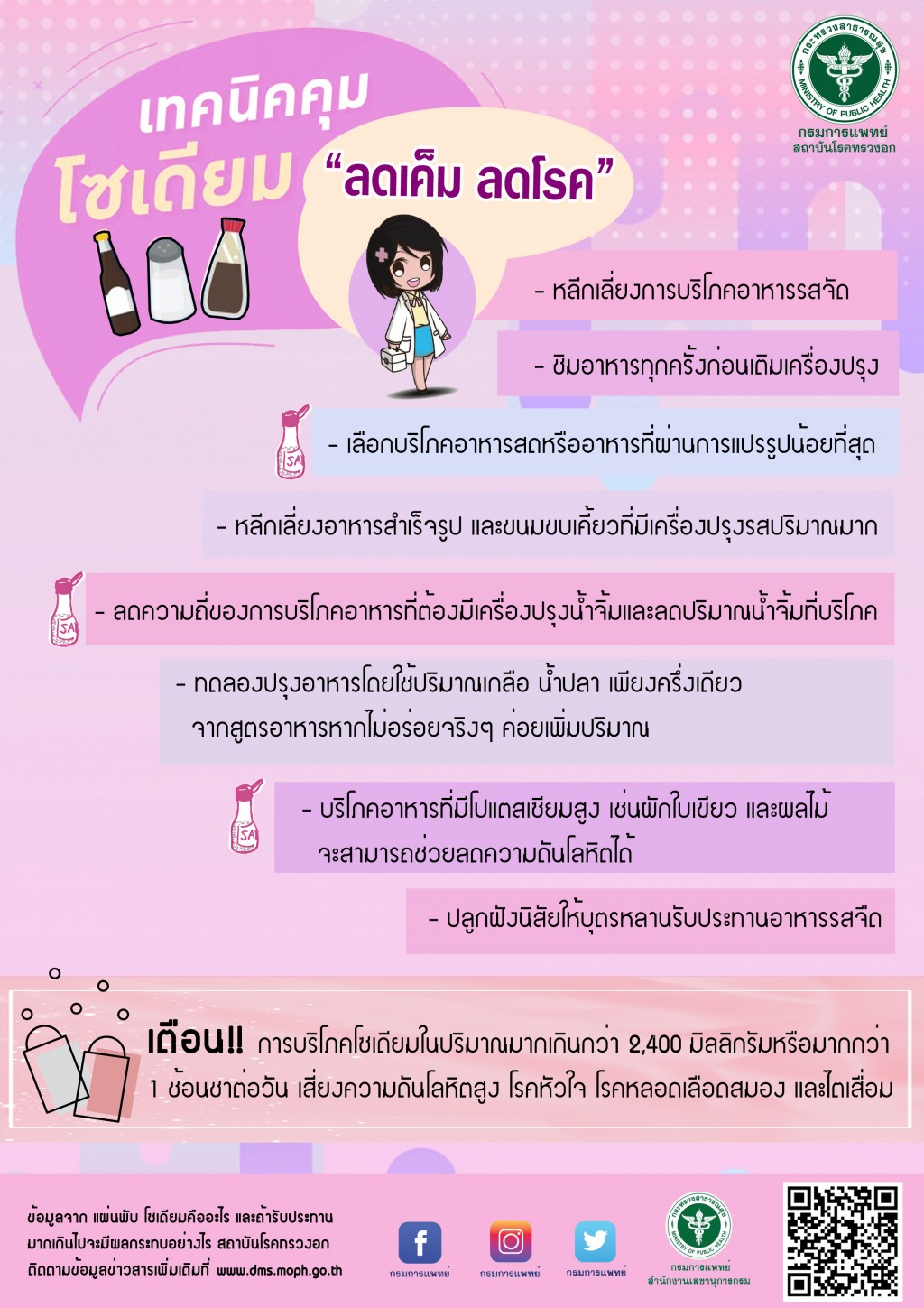 เมื่อวันที่ 15 ม.ค. 63นายแพทย์สมศักดิ์ อรรฆศิลป์ อธิบดีกรมการแพทย์ เปิดเผยว่า โซเดียมเป็นส่วนประกอบของเกลือ ซึ่งเกลือ 1 กรัม จะมีโซเดียมประมาณ 400 มิลลิกรัม โดยร่างกายมีความต้องการโซเดียมประมาณ 2,400 มิลลิกรัมต่อวัน เกลือโซเดียม หรือเกลือแกงเป็นตัวหลักของสารที่ให้ความเค็มในเครื่องปรุงรสที่นิยมใช้ คือ น้ำปลา ซอสถั่วเหลือง ซีอิ๊วขาว ซีอิ๊วดำ เต้าเจี้ยว ฯลฯ และยังใช้ในการถนอมอาหารประเภทหมักดอง เช่น ผักดอง ผลไม้ดอง ไข่เค็ม ปลาร้า ปลาเค็ม เนื้อเค็ม เป็นต้น นอกจากนี้ เกลือโซเดียมยังแฝงมากับอาหารอื่นๆ เช่น ขนมอบกรอบ ผงชูรส หากรับประทานอาหารที่เค็มจัดที่มีเกลือโซเดียม หรือเกลือแกงมากกว่า 6 กรัมต่อวัน หรือมากกว่า 1 ช้อนชาขึ้นไป จะมีโอกาสเสี่ยงต่อการเกิดความดันโลหิตสูงซึ่งในระยะยาวมีผลทำให้กล้ามเนื้อหัวใจหนาตัวขึ้นมีโอกาสเกิดภาวะหัวใจล้มเหลว โรคหลอดเลือดหัวใจ โรคหลอดเลือดสมองและไตเสื่อม