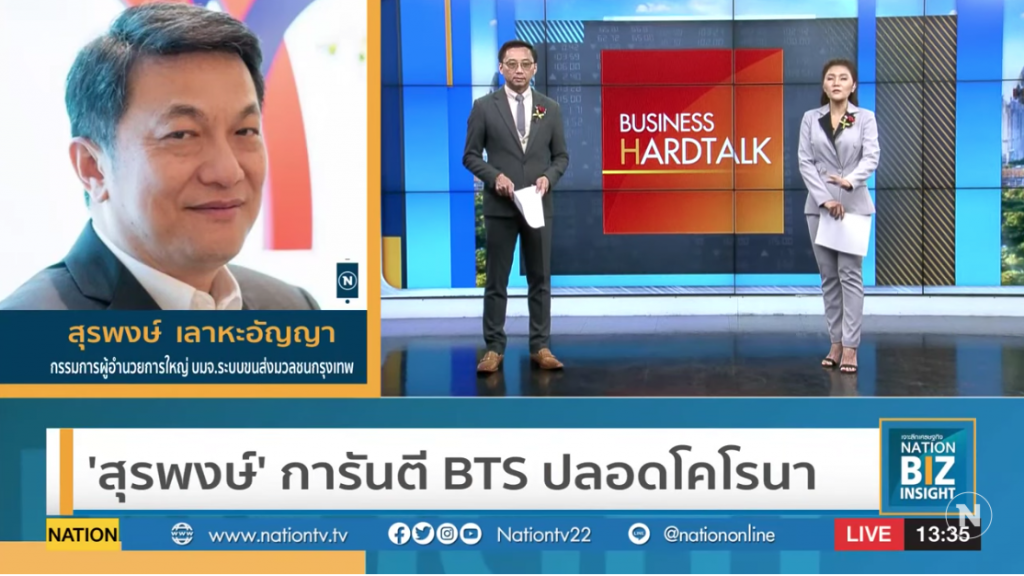 Business Hard Talk คุยกับสุรพงษ์ เลาหะอัญญา กรรมการผู้อำนวยการใหญ่ บมจ.ระบบขนส่งมวลชนกรุงเทพ ผู้ให้บริการรถไฟฟ้าบีทีเอส หลังยกระดับมาตรการป้องกันเชื้อไวรัสโคโรนาแพร่ระบาด พ่นยาฆาเชื้อ เพิ่มความถี่ทำความสะอาด ยืนยันผู้โดยสารยังมั่นใจใช้บริการเฉลี่ย 8 แสนคน/วัน
