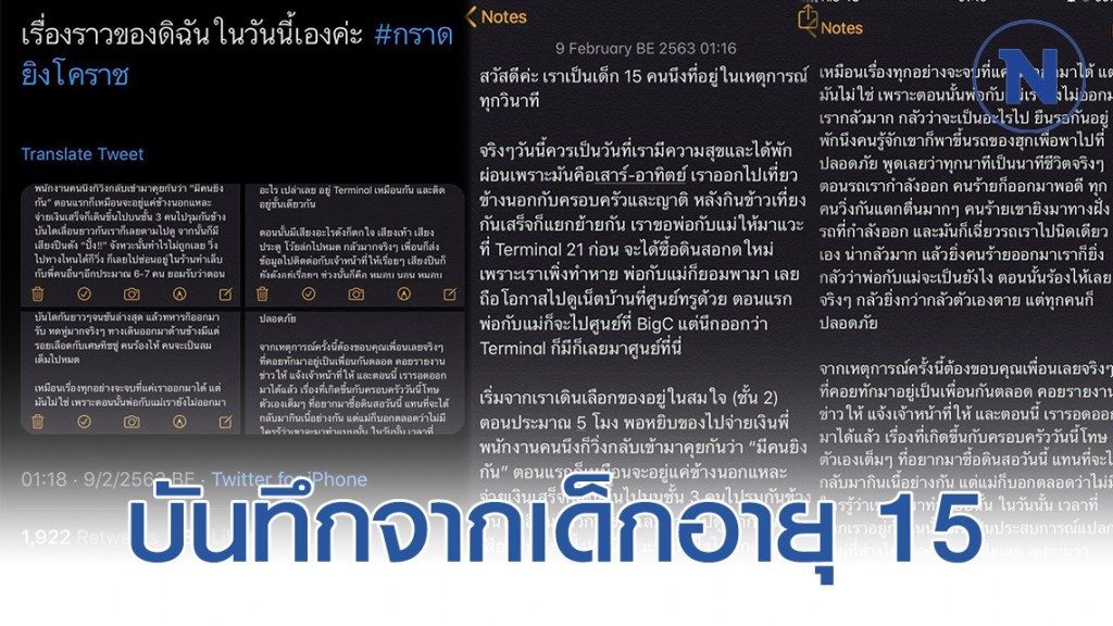 ล่าสุดได้มีการทวิตฯข้อความจาก เด็กน้อยอายุ15 คนหนึ่งที่อยู่ในห้างตอนเกิดเหตุการณ์ โดยน้องได้โพสต์เล่าว่า.........