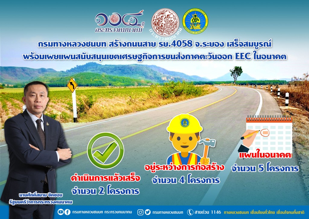 นายปฐม เฉลยวาเรศ อธิบดีกรมทางหลวงชนบท ให้รายละเอียดว่า ที่ผ่านมากรมได้ดำเนินการก่อสร้างถนนทางหลวงชนบทสาย รย.5050 แยกสายนิคมสร้างตนเองสาย 15 บ้านห้วยโป่ง อำเภอนิคมพัฒนา จังหวัดระยอง ระยะทาง 10.198 กิโลเมตรโดยก่อสร้างเสร็จสมบูรณ์เมื่อปี 2560 ใช้งบประมาณในการก่อสร้าง 204 ล้านบาท ขณะนี้มีโครงการที่ดำเนินการก่อสร้างแล้วเสร็จสมบูรณ์อีกจำนวน 1 สายทาง คือ ถนนทางหลวงชนบทสาย รย.4058 แยก ทล.3138 ทล.344 อำเภอบ้านค่าย, วังจันทร์ จังหวัดระยองใช้งบประมาณในการก่อสร้าง 159 ล้านบาท โดยปรับปรุงถนนเดิมให้เป็นถนนลาดยางแอสฟัลต์ติกคอนกรีต 2 ช่องจราจรผิวจราจร กว้าง 7 เมตร ไหล่ทางกว้างข้างละ 1 2.5 เมตร พร้อมก่อสร้างสะพานข้ามคลองชลประทาน 1 แห่ง รวมระยะทาง 32.807 กิโลเมตร เชื่อมระหว่างอำเภอบ้านค่าย ไปยังอำเภอวังจันทร์ ผ่าน 3 ตำบล (ตำบลหนองบัว ตำบลป่ายุบใน ตำบลชุมแสง) ซึ่งพื้นที่ดังกล่าวเป็นพื้นที่ทำการเกษตร เช่น ยางพารา อ้อย มันสำปะหลัง โครงการดังกล่าวนอกจากจะช่วยพัฒนาในเรื่อง EEC แล้วยังช่วยในเรื่องการขนส่งสินค้าให้กับเกษตรกร โดยเฉพาะการขนส่งยางพาราไปยังตลาดกลางยางพาราภาคตะวันออกอีกด้วย