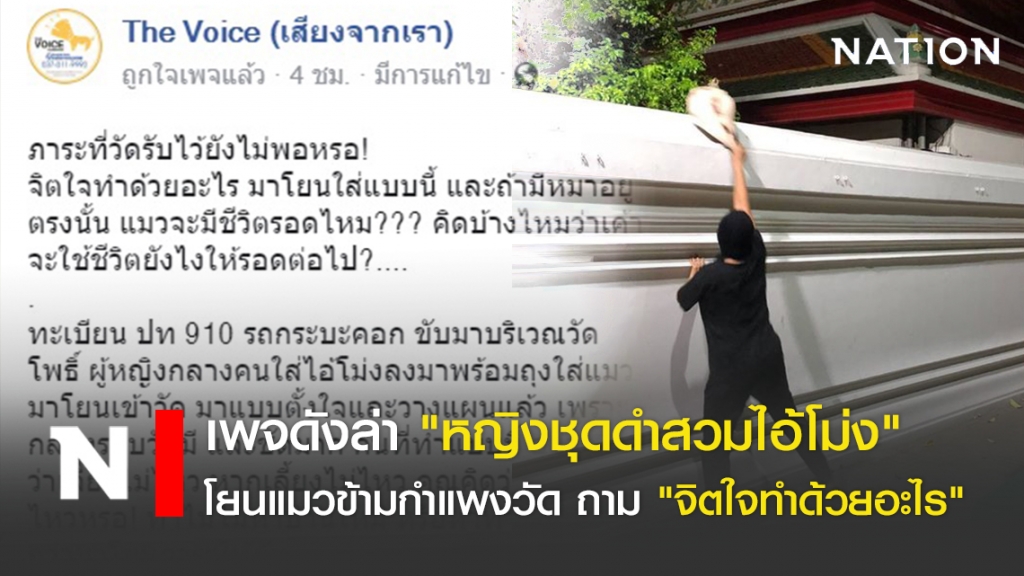 เพจเฟซบุ๊ก The Voice (เสียงจากเรา) ได้โพสต์รูปภาพพร้อมข้อความ ถามหา "ผู้หญิงชุดดำสวมไอ้โม่ง" ที่นำแมวใส่ถุงแล้วโยนข้ามกำแพงวัด โดยระบุข้อความว่า