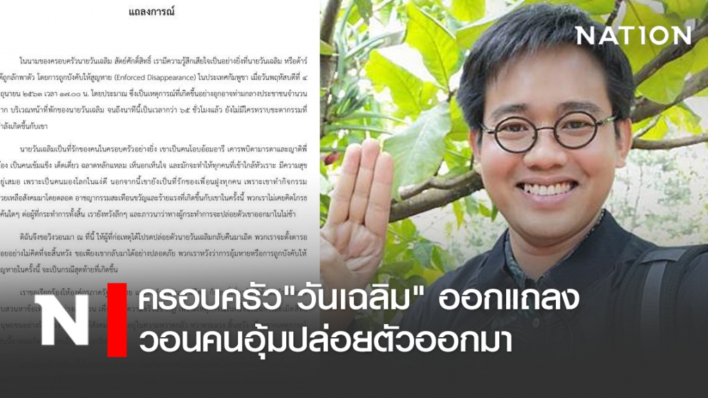 ในนามของครอบครัวนายวันเฉลิม สัตย์ศักดิ์สิทธิ์ เรามีความรู้สึกเสียใจเป็นอย่างยิ่งที่วันเฉลิม หรือต้าร์ ได้ถูกลักพาตัวโดยการถูกบังคับให้สูญหาย (EnforcedDisappearance) ในประเทศกัมพูชาเมื่อวันพฤหัสบดีที่ 4 มิถุนายน 2563 เวลา 17.00 น. โดยประมาณ ซึ่งเป็นเหตุการณ์ที่เกิดขึ้นอย่างอุกอาจท่ามกลางประชาชนจํานวนมาก บริเวณหน้าที่พักของวันเฉลิม จนถึงนาทีนี้เป็นเวลากว่า 65 ชั่วโมงแล้ว ยังไม่มีใครทราบชะตากรรมที่กําลังเกิดขึ้นกับเขา