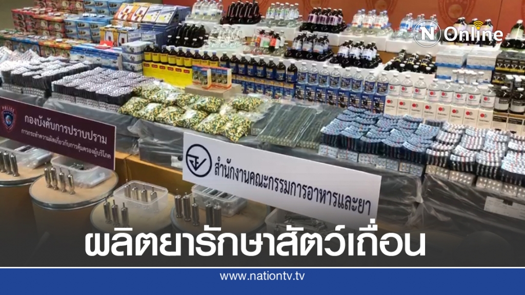 ก่อนเข้าตรวจค้น พบเป็นโกดัง แหล่งลักลอบผลิตยาสัตว์ไม่มีทะเบียน ได้แก่ 1.กลุ่มยาฉีดและยากิน ยี่ห้อ Ivermec,En-Dex ระบุสรรพคุณป้องกันโรคพยาธิหนอนหัวใจสำหรับสุนัขและแมว รักษาโรคเรื้อน กำจัดปรสิต 2.กลุ่มยาฆ่าเชื้อชนิดฉีดและกิน ยี่ห้อ เอนโร,ด็อกซี่,ลินสเปค ใช้รักษาอาการท้องร่วง ลำไส้อักเสบ ปอดบวม แผลติดเชื้อ และ 3.กลุ่มยาฮอร์โมนสำหรับไก่ ยี่ห้อ บิ๊กเอ็ม,บลัดแคร์ ใช้เร่งกล้ามเนื้อสำหรับม้า เจ้าหน้าที่จึงยึดยาไม่มีทะเบียนพร้อมอุปกรณ์ที่ใช้ในการผลิตรวม 100 รายการ มูลค่ากว่า 50 ล้านบาท
