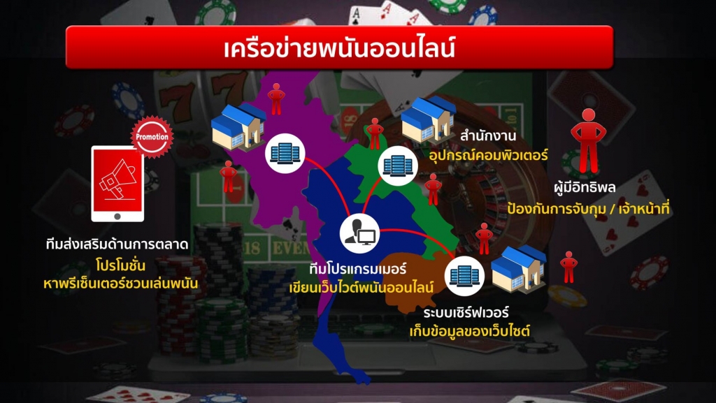 นายเอ (นามสมมุติ) อดีตเครือข่ายพนันออนไลน์ บอกว่าอันดับแรกจะต้องจ้างทีมโปรแกรมเมอร์ เพื่อเขียนโปรแกรมสร้างเป็นเว็บไซต์พนันออนไลน์ที่มีรูปแบบให้นักพนันได้เลือกเล่นพนันขึ้นมา ซึ่งเมื่อได้โปรแกรมการเล่นพนันออนไลน์จากฝีมือโปรแกรมเมอร์แล้ว ก็จะต้องหาที่เก็บโปรแกรมพนันออนไลน์ ที่เรียกว่า "เซิร์ฟเวอร์" โดยจะเก็บเซิร์ฟเวอร์นี้ไว้แหล่งเก็บข้อมูลที่เป็นสร้างไว้เป็นสำนักงานหรือออฟฟิศ พร้อมติดตั้งคอมพิวเตอร์หลายสิบเครื่องไว้เพื่อคอยควบคุมการเล่นพนันจากนักเสี่ยงโชคในเว็บไซต์ ซึ่งจะเลือกแหล่งกบดานที่อยู่ในประเทศเพื่อนบ้านรอบๆบ้านเรา กัมพูชา เมียนมา จีน เพราะป้องกันการจับกุมจากเจ้าหน้าที่่ และที่ขาดไม่ได้เลย ก็คือ ทีมงานส่งเสริมด้านการตลาดที่จะเฟ้นหากลุ่มลูกค้า และการจัดหาเน็ตไอดอลมาเป็นพรีเซ็นเตอร์ช่วยทำโฆษณาชวนเชื่อจากนักพนัน รวมถึงการจัดโปรโมชั่นให้กับลูกค้า บางเว็บไซต์ยังมีการจ้างทีมโปรดักชั่นมาถ่ายทำเพื่อสร้างความสมจริงและความน่าเชื่อถือ