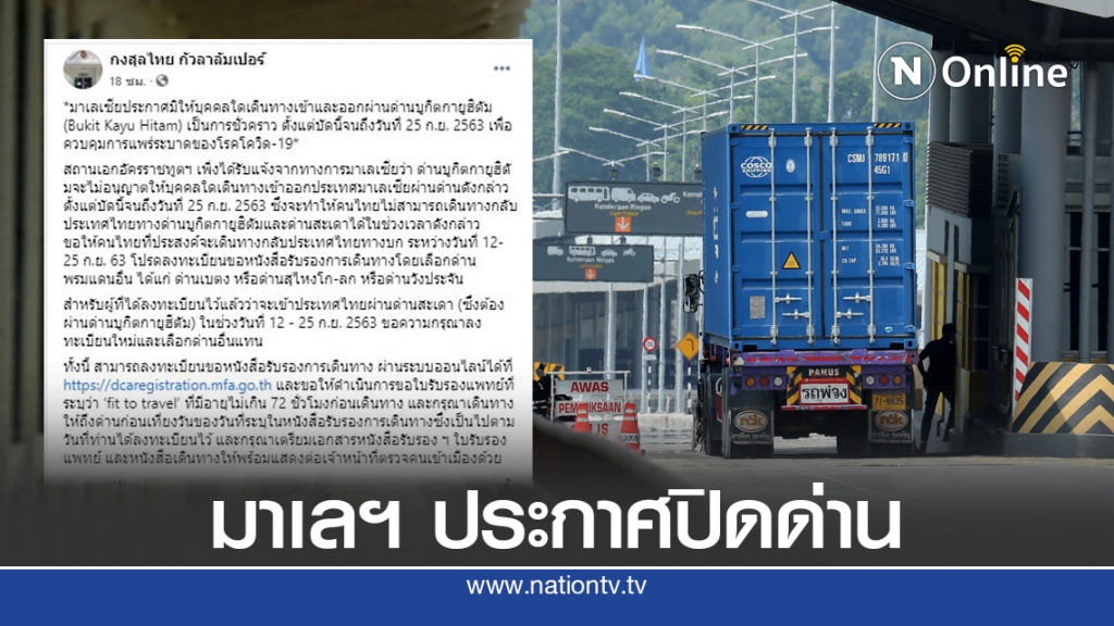 เมื่อวันที่ 11 ก.ย. 63 ที่เฟสบุ๊ค "กงสุลไทย กัวลาลัมเปอร์" ได้โพสต์ข้อความว่า *มาเลเซียประกาศมิให้บุคคลใดเดินทางเข้าและออกผ่านด่านบูกิตกายูฮิตัม (Bukit Kayu Hitam) เป็นการชั่วคราว ตั้งแต่บัดนี้จนถึงวันที่ 25 ก.ย. 2563 เพื่อควบคุมการแพร่ระบาดของโรคโควิด-19*