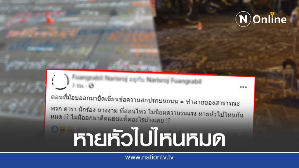 ล่าสุดชาวเน็ตท่านหนึ่งที่ใช้ชื่อเฟซบุ๊กว่า 'Fuangrabil Narisroj'ก็ได้ออกมาตัดพ้อแสดงถึงการกระทำของกลุ่มผู้ชุมนุม และแซะ ฟาดไปถึงกลุ่มคนดัง ดารา นักร้อง นางงาม ที่ไม่นิยมความรุนแรง ว่าหายไปไหน ไม่ออกมาพูดถึงเรื่องการทำลายของสาธารณะ โดยมีเนื้อหาว่า "ตอนที่ม๊อบออกมาขีดเขียนข้อความสกปรกบนถนน = ทำลายของสาธารณะ พวก ดารา นักร้อง นางงาม ที่อ่อนไหว ไม่นิยมความรุนแรง หายหัวไปไหนกันหมด !? ไม่มีออกมาติดแฮชแท็คอะไรบ้างเลย !?"