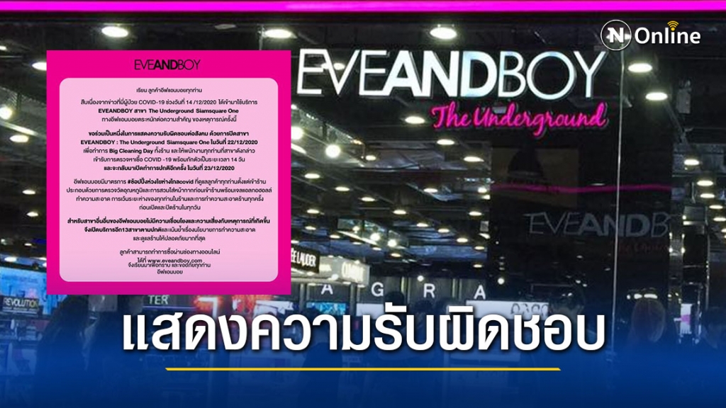 ผู้สื่อข่าวรายงานว่า เพจเฟซบุ๊ก Eveandboy ได้ประกาศ ปิดชั่วคราว สั่งพนักงานกักตัว 14 วัน โดยสาขาที่ปิดคือ The Underground Siamsquare One เรียน ลูกค้าอีฟแอนบอยทุกท่าน สืบเนื่องจากข่าวที่มี่ผู้ป่วย COVID-19 ช่วงวันที่ 14 /12/2020 ได้เข้ามาใช้บริการ EVEANDBOY สาขา The Underground Siamsquare One ทางอีฟแอนบอยตระหนักต่อความสำคัญ
