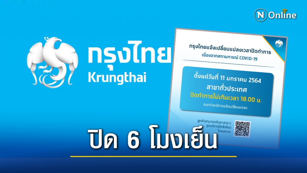 กรุงไทยขอแจ้งเปลี่ยนแปลงเวลาปิดทำการสาขาทั่วประเทศ เนื่องจากสถานการณ์ COVID-19 ตั้งแต่วันที่ 11 มกราคม 2564