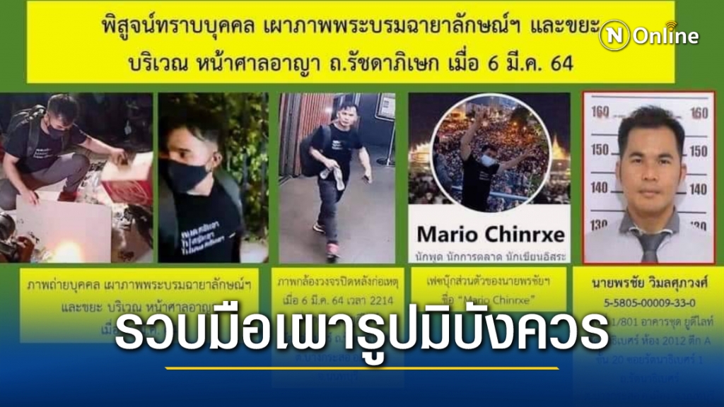 หลังสืบทราบว่าบุคคลดังกล่าวมาหลบซ่อนตัวอยู่ภายในคอนโดมิเนียมที่เข้าทำการจับกุม โดยชุดสืบสวนกองบัญชาการตำรวจนครบาลพบข้อมูลว่าชายคนดังกล่าวเป็นบุคคลที่ตำรวจชุดสืบสวนสามารถพิสูจน์ทราบบุคคลว่าก่อเหตุพ่นสีรั้วสำนักงานตำรวจแห่งชาติเมื่อวันที่ 18 พฤศจิกายน 2563 ในระดับการชุมนุมร่วมกับกลุ่มราษฎร และยังพบอีกว่าเป็นผู้เผาทำลายพระบรมฉายาลักษณ์ และของสิ่งของที่หน้าศาลอาญาถนนรัชดาภิเษก เมื่อวันที่ 6 มีนาคมที่ผ่านมา นอกจากนี้หลังก่อเหตุทุกครั้งนายพรชัย ยังนำภาพและคลิปวีดีโอลงเผยแพร่ใน facebook โดยใช้ชื่อว่า มาริโอ้ ชินร์เซ (Mario Chinrxe) ทั้งเหตุการณ์ที่หน้าสำนักงานตำรวจแห่งชาติ และที่หน้าศาลอาญา ถนนรัชดาภิเษก แล้วยังพบว่าผู้ต้องหารายดังกล่าวยังเคยกระทำความผิดในลักษณะเดียวกันที่จังหวัดยะลา