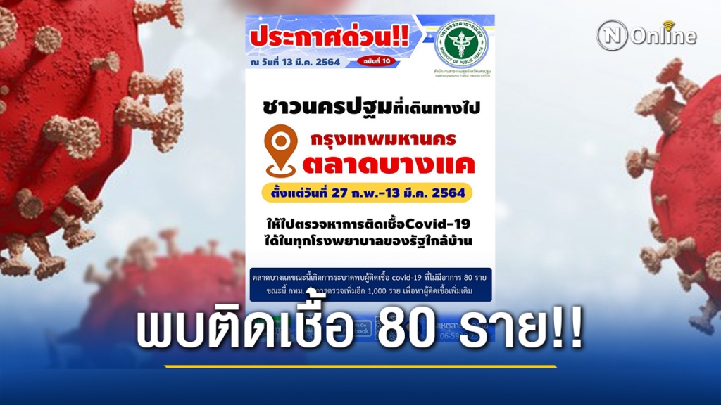 เมื่อวันที่ 13 มีนาคม 2564 ที่จังหวัดนครปฐม ประกาศด่วน ชาวนครปฐม หากท่านเดินทางไปตลาดบางแค กทม.ตั้งแต่วันที่ 27 ก.พ. -13 มี.ค.2564 ให้ขอรับการตรวจคัดกรองหาเชื้อ โควิด ที่โรงพยาบาลรัฐ ใกล้บ้าน