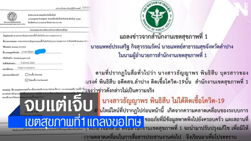 ล่าสุด นายณรงค์ศักดิ์ โอสถธนากรผู้ว่าราชการจังหวัดลำปาง เปิดเผยว่าขณะนี้ทางจังหวัดลำปางได้ดำเนินการเกี่ยวกับเรื่องความผิดพลาดที่เกิดขึ้นด้วยการที่ ออกประกาศแถลงการณ์ จากสำนักงานเขตสุขภาพที่ 1ซึ่งมีหน้าที่ดูแลงานสาธารณสุขในเขตจังหวัดภาคเหนือตอนบน โดยมีนายแพทย์ประเสริฐกิจสุวรรณรัตน์ นายแพทย์สาธารณสุขจังหวัดลำปาง ในนามผู้อำนวยการสำนักงานสุขภาพที่1 ระบุว่าเรื่องมีข่าวว่า น.ส.ธัญพร พินธิสืบ ซึ่งเป็นบุตรสาวของนายณรงค์พินธิสืบอดีต ส.อบจ.ลำปาง ติดเชื้อโควิด-19 นั้น ขอชี้แจงว่า ข่าวดังกล่าวไม่เป็นความจริงเนื่องจากเกิดความคลาดเคลื่อนของระบบการสื่อสาร สำนักงานเขตสุขภาพที่1ขออภัยที่มีข้อมูลพาดพิงไปยังครอบครัว และสถานที่ต่างๆ ที่เกี่ยวข้องโดยสำนักงานสุขภาพที่1 จะนำมาปรับปรุงแก้ไข เพื่อมิให้เกิดความคลาดเคลื่อนในการสื่อสารต่อไป