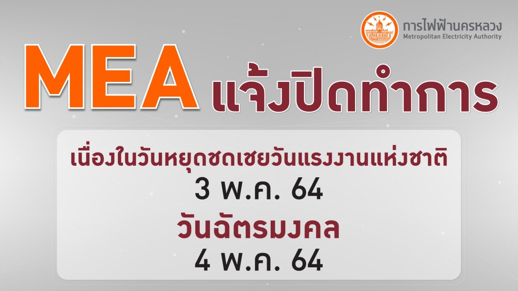 การไฟฟ้านครหลวง หรือ MEA จะปิดทำการทุกแห่งเนื่องในวันหยุดชดเชยวันแรงงานแห่งชาติ และวันฉัตรมงคล ระหว่างวันที่ 3-4 พฤษภาคม 2564 รวมถึงเคาน์เตอร์ที่ศูนย์บริการภาครัฐแบบเบ็ดเสร็จ (Government Center) ที่ตั้งอยู่ภายในจุดเคาน์เตอร์บริการอำเภอ..ยิ้ม ณ ศูนย์การค้าเซ็นทรัลพลาซาเวสต์เกต โซน Fashion ชั้น 1 เซ็นทรัลแจ้งวัฒนะ บริเวณชั้น 3 และห้างสรรพสินค้าเดอะมอลล์งามวงศ์วาน บริเวณชั้น 3 ซึ่งงดให้บริการชั่วคราวจนกว่ามีคำสั่งเปลี่ยนแปลง หรือสถานการณ์ระบาดของ COVID-19 เข้าสู่ภาวะปกติ โดย MEA จะเปิดทำการและให้บริการตามปกติ ในวันพุธที่ 5 พฤษภาคม 2564 ระหว่างเวลา 07.30 15.00 น. ทั้งนี้ หากมีการปรับเปลี่ยนการให้บริการตามสถานการณ์ MEA จะประชาสัมพันธ์ให้ทราบต่อไป จึงขอให้ประชาชนติดตามข้อมูลข่าวสารอย่างใกล้ชิด