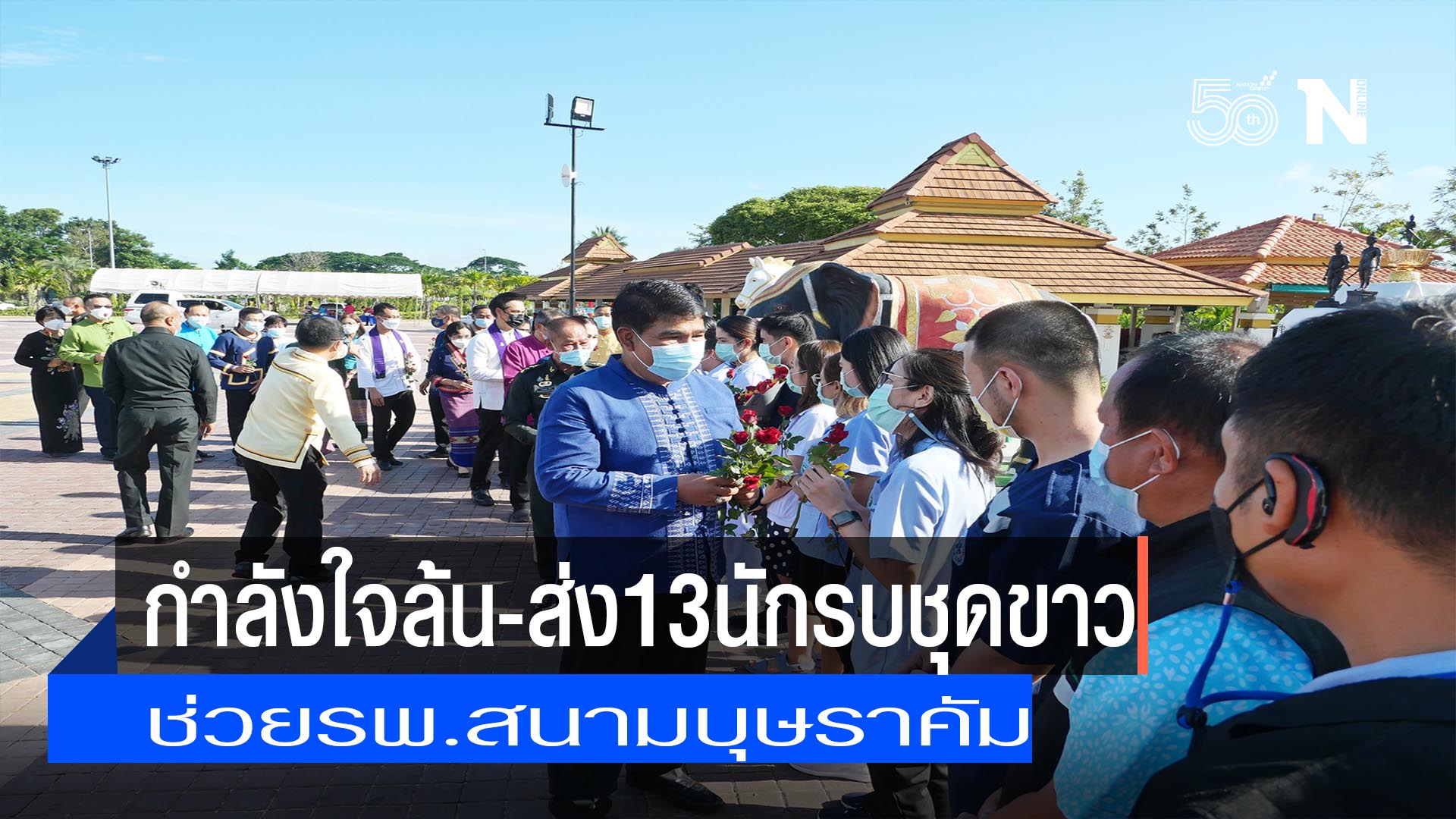 วันที่ 14 กรกฎาคม 2564 ที่บริเวณลานอนุสาวรีย์พญางำเมือง ชายกว๊านพะเยา นายโชคดี อมรวัฒน์ ผู้ว่าราชการจังหวัดพะเยา นพ.ศุภชัย บุญอำพันธ์ นายแพทย์สาธารณสุขจังหวัดพะเยา พร้อมด้วย ตัวแทนโรงพยาบาลต่างๆในจังหวัดพะเยา ได้พร้อมใจกันมาให้กำลังใจกับคณะ “นักรบชุดขาว” ตัวแทนบุคลากรทางการแพทย์ โรงพยาบาลในจังหวัดพะเยา ที่จะเดินทางไปดูแลช่วยเหลือผู้ป่วยติดเชื้อโควิด-19 ณ โรงพยาบาลสนามบุษราคัม อิมแพ็คชาเลนเจอร์ เมืองทองธานี อำเภอปากเกร็ด จังหวัดนนทบุรี