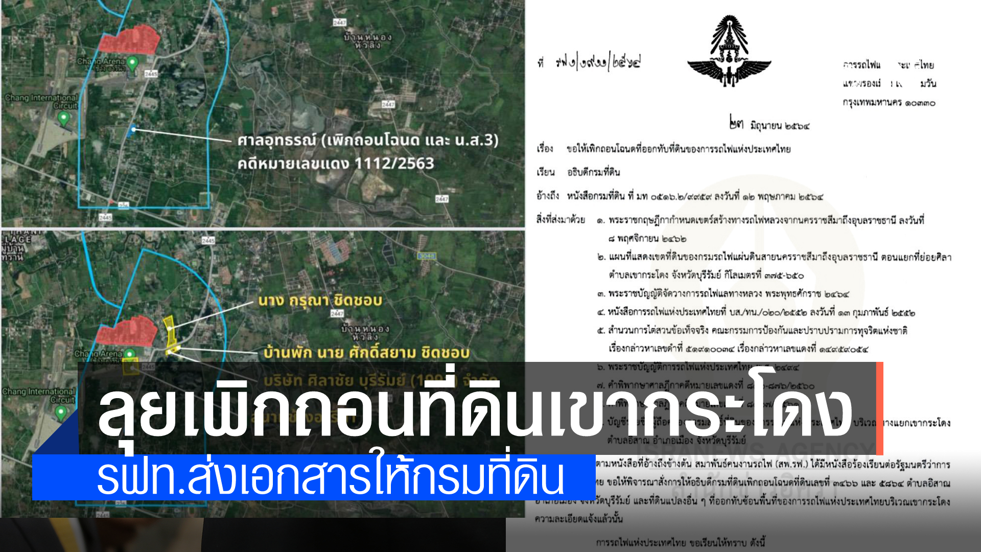 ล่าสุดมีรายงานว่า เมื่อวันที่ 24-25 ก.ค.ที่ผ่านมา การรถไฟแห่งประเทศไทย หรือ รฟท.ได้มีหนังสือที่ รฟ 1/1911/2564 ลงวันที่ 23 มิ.ย.64 ส่งเรื่องให้กรมที่ดินพิจารณาดำเนินการเพิกถอนหนังสือแสดงสิทธิในที่ดิน ที่ออกทับที่ดินของการรถไฟฯ ในพื้นที่บริเวณเขากระโดง อ.เมืองบุรีรัมย์ จ.บุรีรัมย์ เนื้อที่ประมาณ 5,083 ไร่