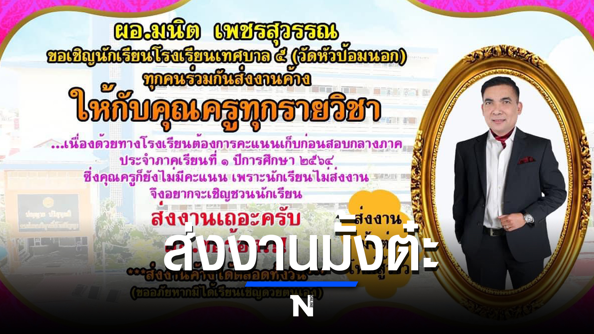 เนื่องด้วยทางโรงเรียนต้องการคะแนนเก็บก่อนสอบกลางภาค ประจำภาคเรียนที่ 1 ปีการศึกษา 2564 ซึ่งคุณครูก็ยังไม่มีคะแนน เพราะนักเรียนไม่ส่งงาน จึงอยากจะเชิญชวนนักเรียนส่งงานเถอะครับ ผอ.ขอร้อง “ส่งงานค้างได้ตลอดทั้งวัน” (ขออภัยหากมิได้เรียนเชิญด้วยตนเอง) ส่งงานมั้งต๋ะโหม๋สู๊ววว